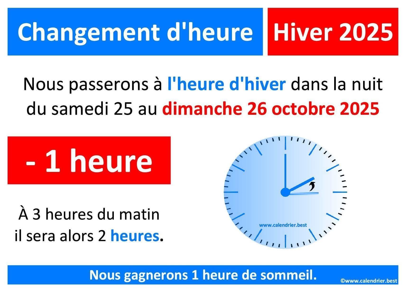 🚨 Changement d’heure 24 October 2025 by Quentin Changement d’heure : dans la nuit du samedi 25 au dimanche 26 octobre 2025, nous gagnerons une heure de sommeil car nous passerons à l’heure d’hiver À 3 heures du matin, il sera 2 heures !