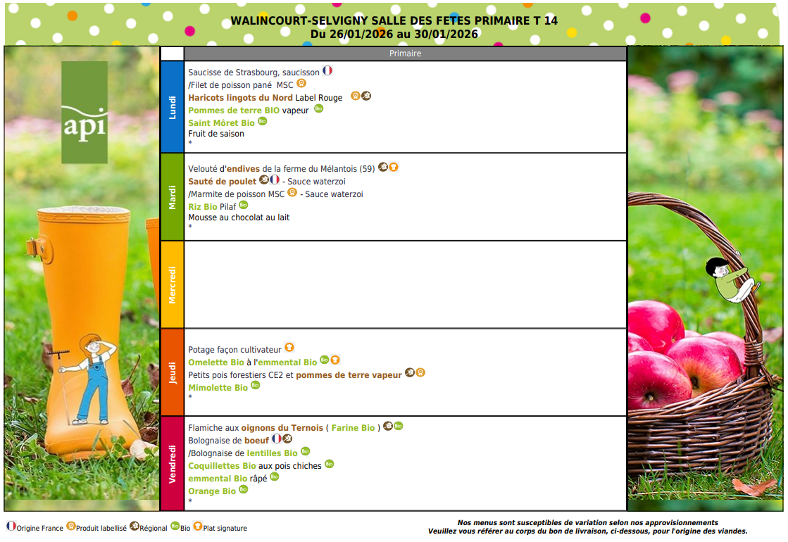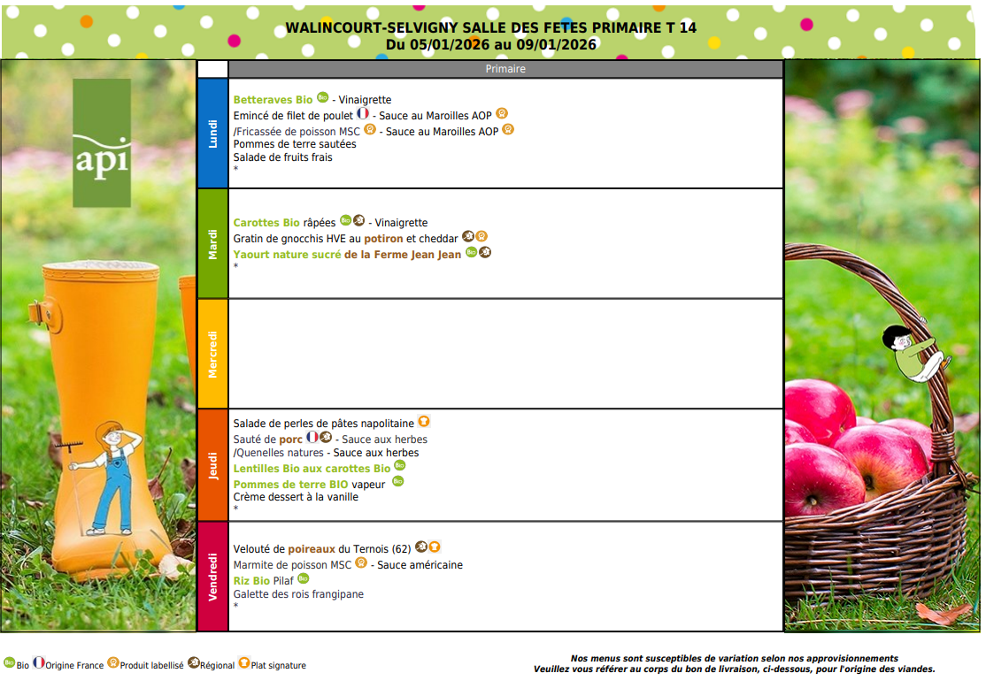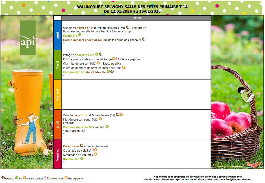Vous trouverez ci-dessous les menus de cantine pour Janvier 2026 :