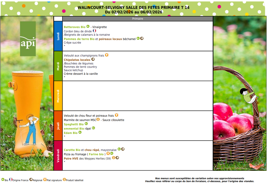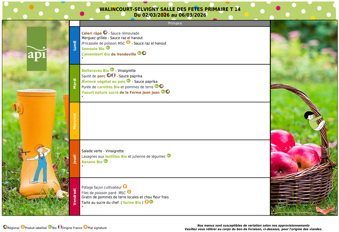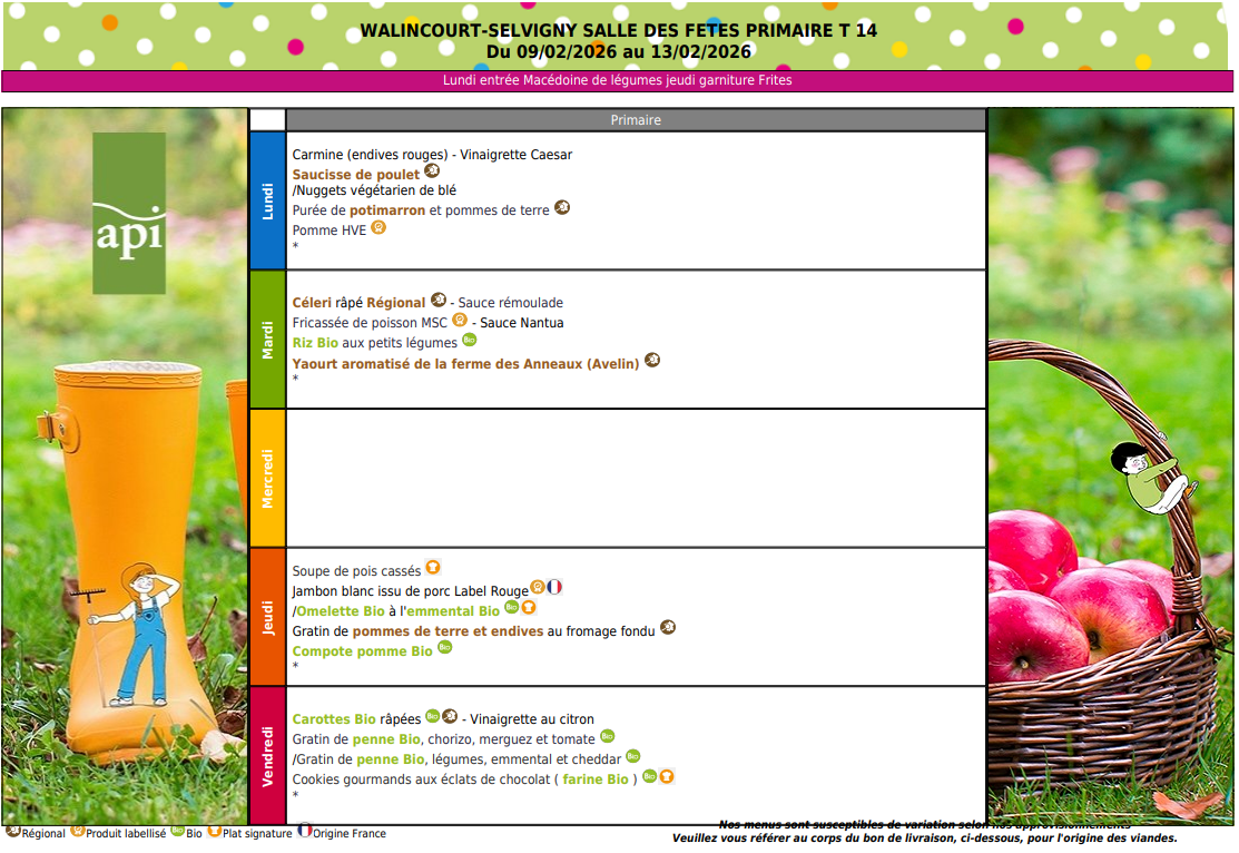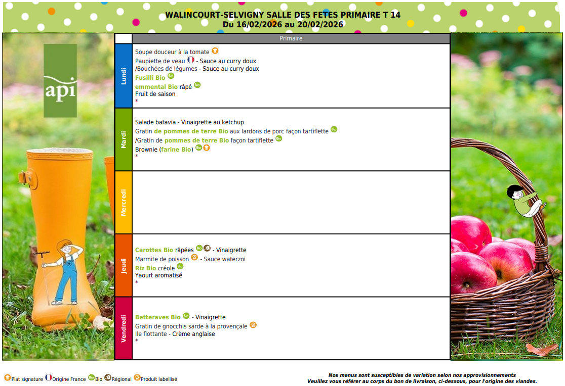 Vous trouverez ci-dessous les menus de cantine pour Février 2026 :